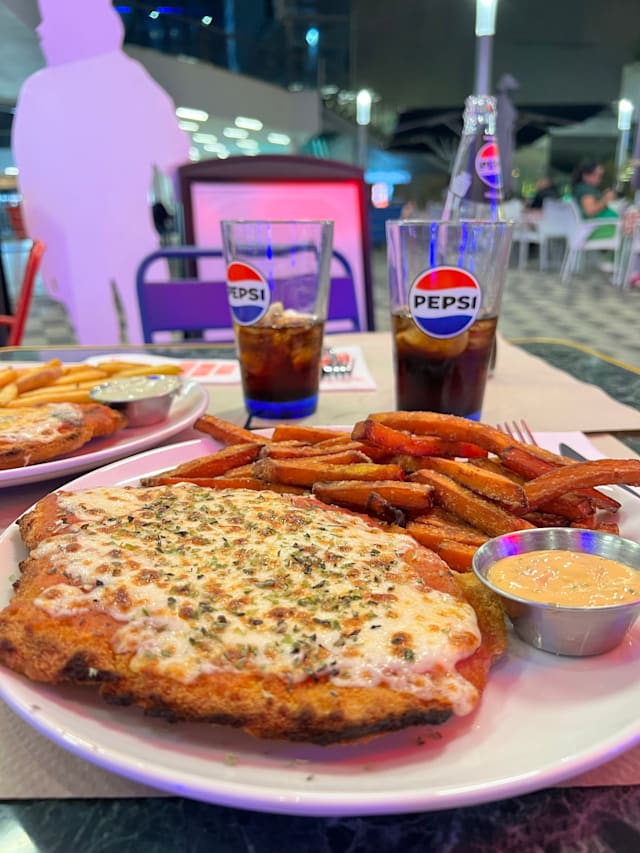 Milanesa de pollo, tomate, mozzarella, jamón dulce, tomate seco y pesto de pistacchio. Incluye patatas fritas o ensalada