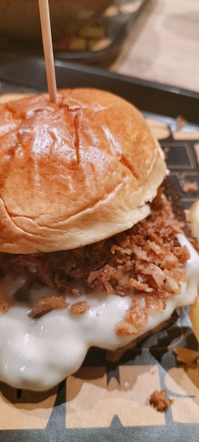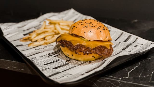 Disco de vaca madurada 90gr, queso emmental, cebolla crujiente y mayo tartufata.