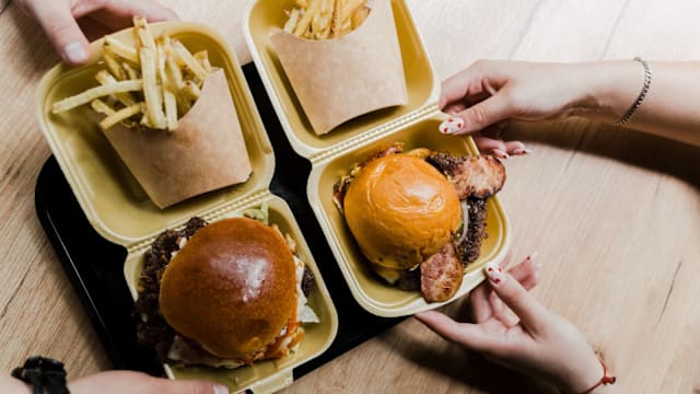 3 Discos de vaca pepinillos, madurada, 2 pechugas de pollo rebozadas, 2 huevos fritos, 5 lonchas de bacon, pepinillos, salsa besmash y salsa cheddar con 300gr de patatas fritas.
