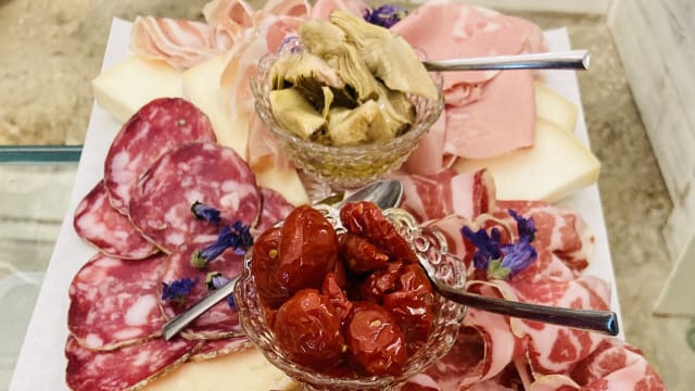 Bresaola di black angus con citronette, olive taggiasche di Loano, capperini di Pantelleria, pomodorini freschi del contadino,pepe del Malabar