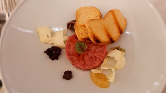 Tartare di manzo con crostoni di pane caldo alla brace e selezione di condimenti