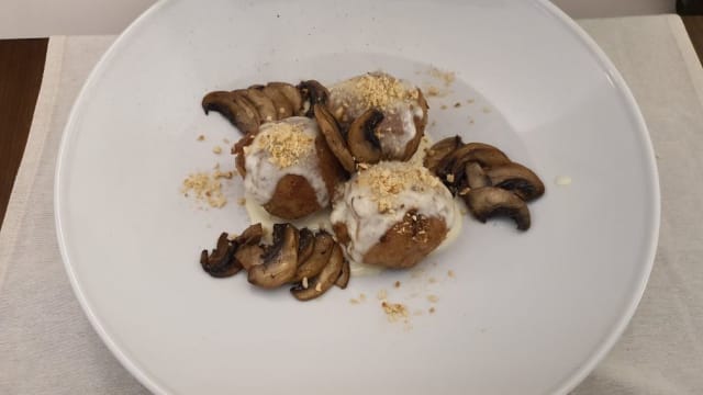Battuta di porcini spadellati su crostone di pane alla brace uovo di quaglia, tartufo e olive taggiasche