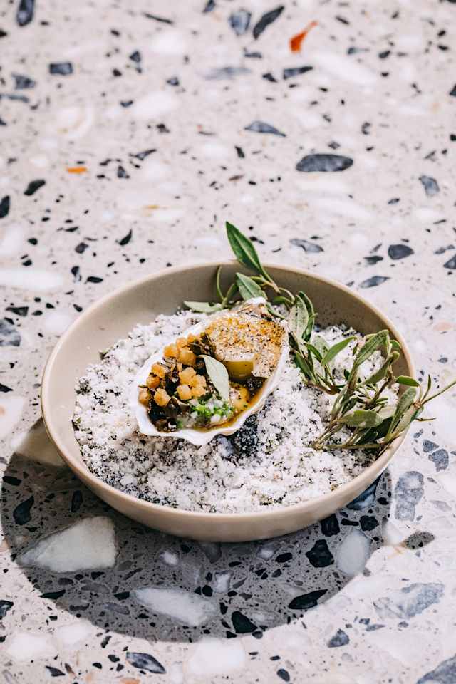 - Ostra de Setúbal com alho-francês assado e sabayon de algas un.
