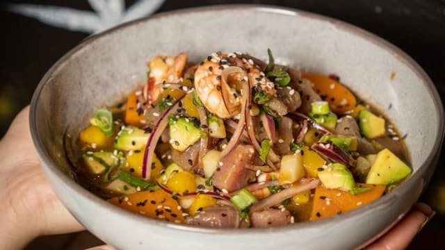 Écrasé de pommes de terre légèrement pimenté et citronné, thon émietté, avocat avec son ceviche