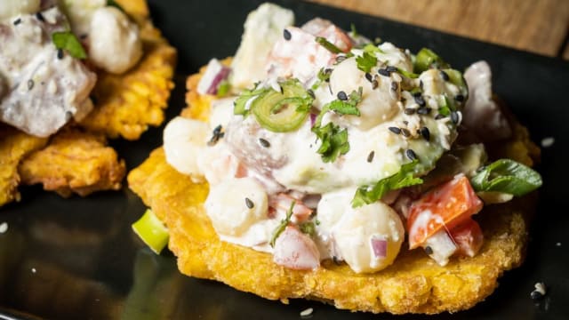 Galettes de banane plantain frite avec garniture à base de thon frais