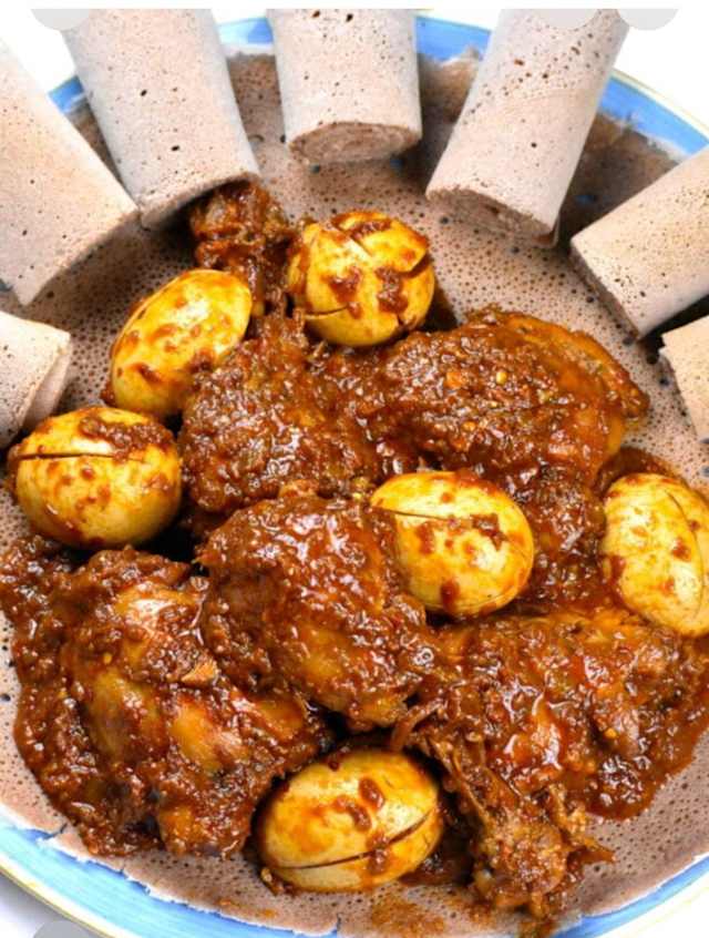 - Poulet en sauce mijoté assaisonné de rerbere (mélange d'épices éthiopiennes), oents durs. Accompagne d'aieb (fromage éthiopien), de valado et d'injera