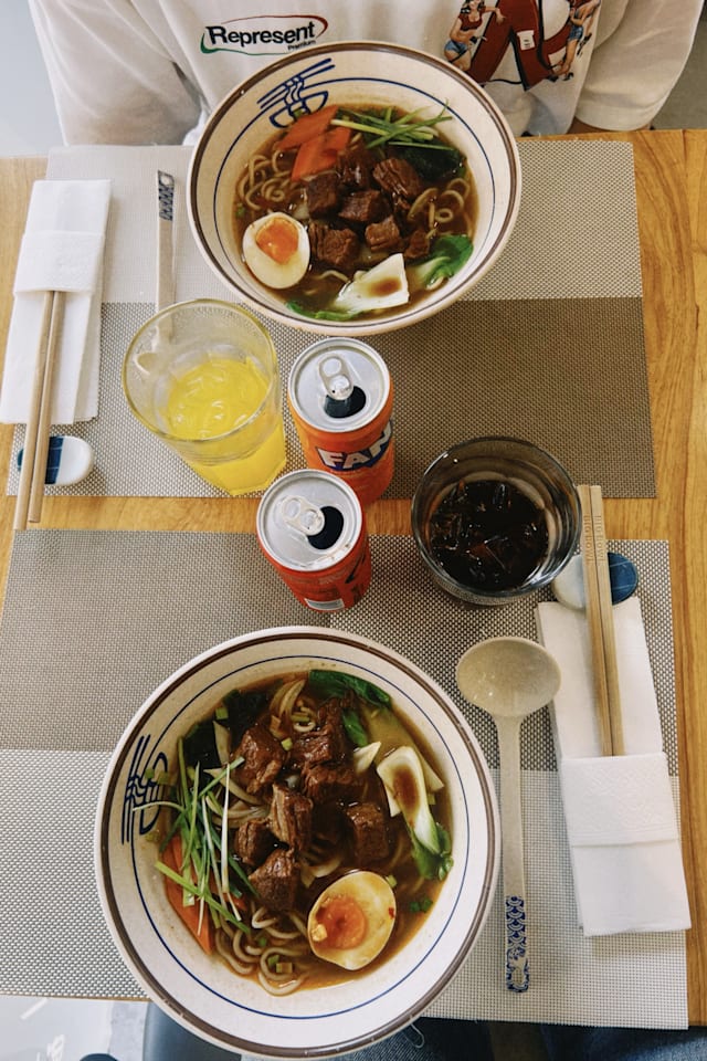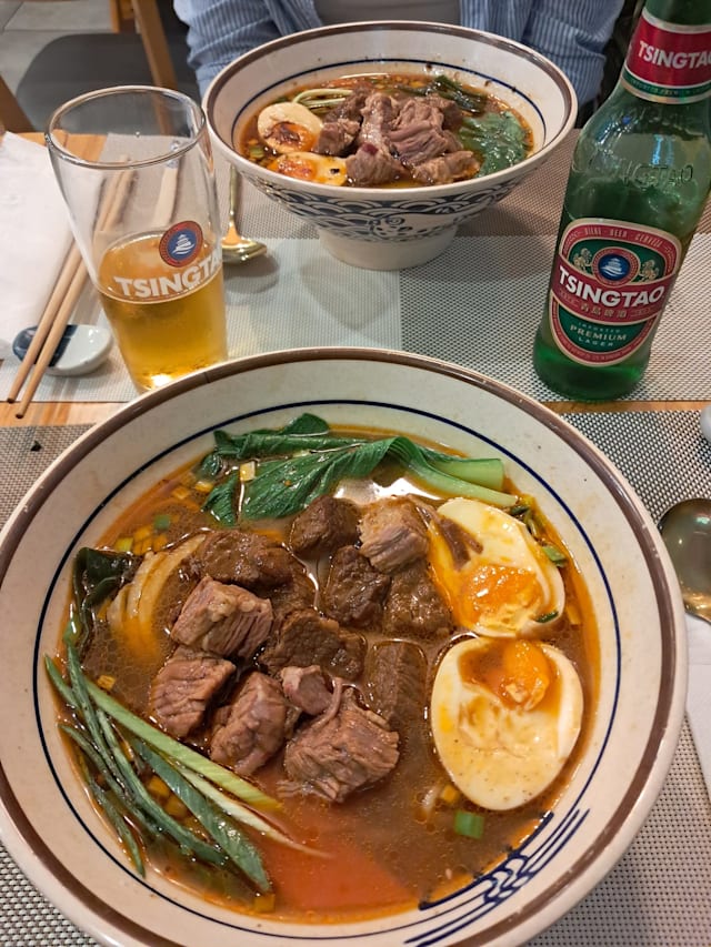 Ramen Soup Rice Noodle with slow-braised Beef Bone soup,Topped with slow cooked Beef,Onions and Fresh Herbes.