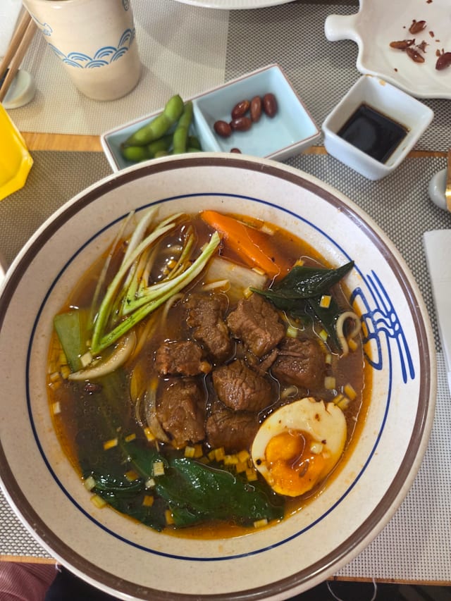 Ramen soup noodle with stewed beef, various vegetables, onions and egg, intensive flavor and little spicy