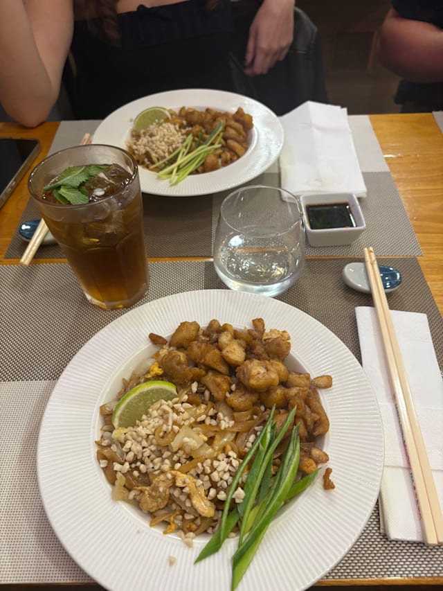 Thai style stir-fried rice noodle with eggs, vegetables, onions and shrimp/chicken.