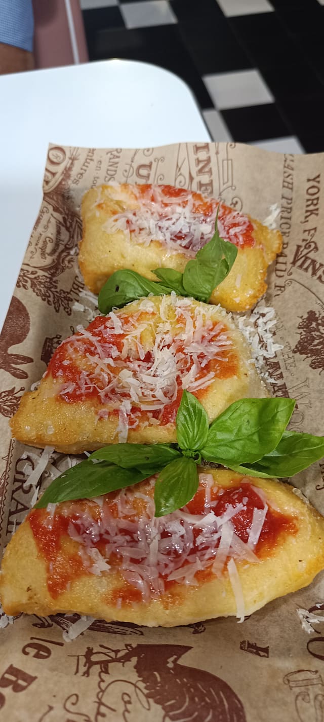 (montanara con salsa di pomodoro,scaglie di grana,basilico montanara con pesto di pistacchio,mortadella, granella di pistacchio,basilico-montanara con salsa di pomodoro, melanzane a funghetto, scaglie di grana, basilico.)