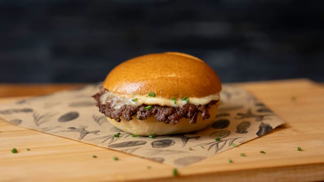 - Petit bun du boulanger, bœuf smashé, raclette au lait cru, ciboulette, sauce Tata Fernande (sauce cocktail artisanale)