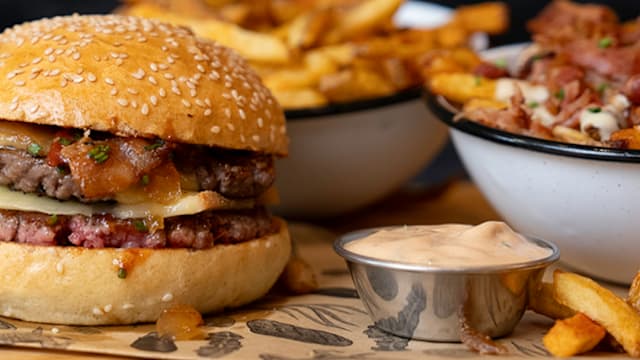 - Petit bun du boulanger, bœuf smashé, poitrine de porc fumée, raclette au lait cru, oignons frits, ciboulette, sauce Tata Fernande (sauce cocktail artisanale)