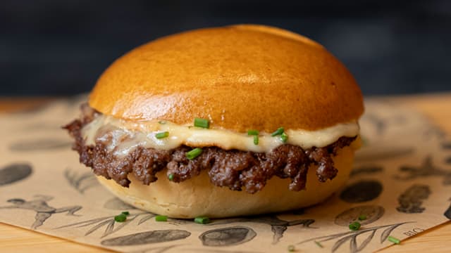 - Petit bun du boulanger, bœuf smashé, raclette au lait cru, ciboulette, sauce Tata Fernande (sauce cocktail artisanale)