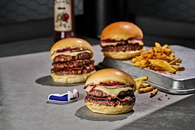 - Bun du boulanger, bœuf de race origine France smashé, poitrine de porc fumée, raclette au lait cru, oignons frits, ciboulette, sauce tata fernande (sauce cocktail artisanale)