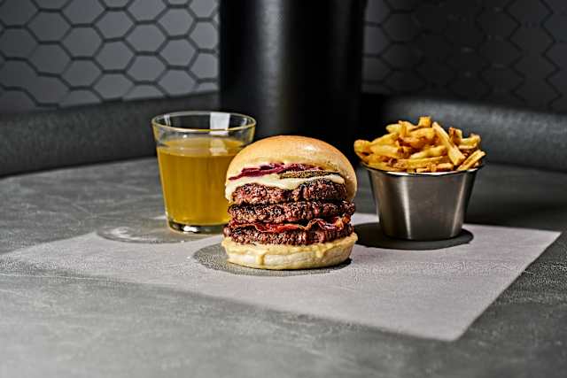 - Bun sésame du boulanger, galette de pomme de terre, double tomme des alpes au lait cru, oignons frits, sauce pépère (sauce artisanale au poivre 1,5%)