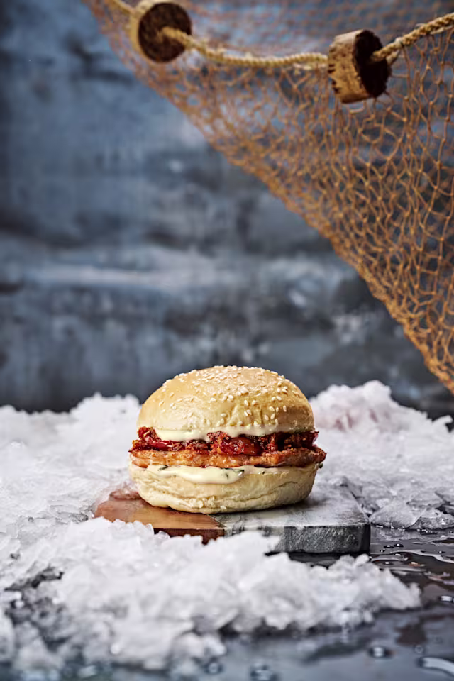 - Bun sésame du boulanger, steak de saumon, crispy de thon épicé, tomates mi-séchées, double dose de sauce franche (sauce blanche artisanale)