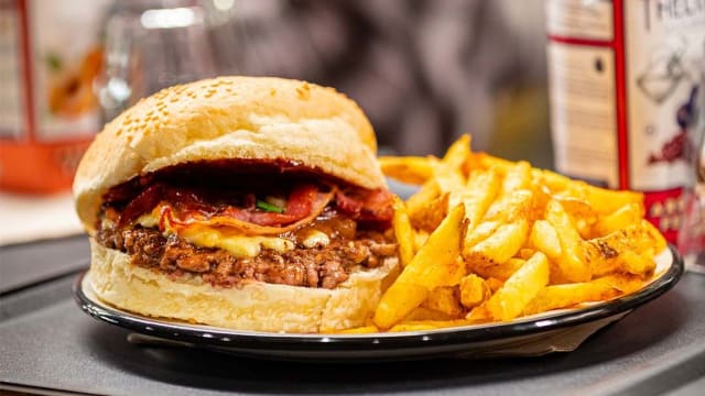 - Petit bun du boulanger, bœuf smashé, raclette au lait cru, ciboulette, sauce tata fernande (sauce cocktail artisanale)
