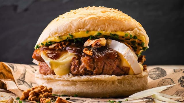 - Veau, fourme d’ambert AOP (bleu crémeux), oignons confits, coriandre, sauce tonton fernand (mayonnaise artisanale délicatement sucrée)