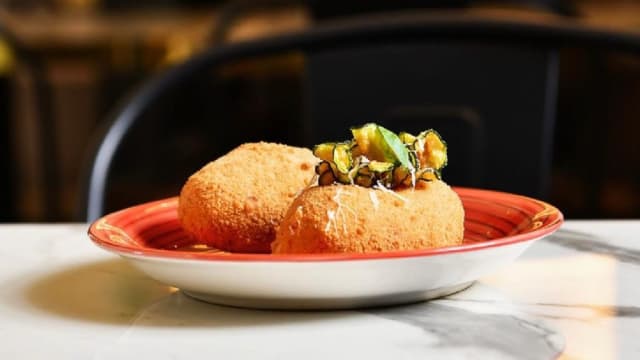 Fiori di zucca con panatura al panko ripieni di ricotta cremosa , provola, zest di limone e pepe nero.