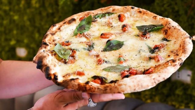 Pomodoro marzanella giallo, guanciale amatriciano, pomodoro pacchetelle del parco nazionale del vesuvio DOP, fior di latte, fuori cottura, fonduta di pecorino romano DOP, cristalli di bacon, pepe nero macinato fresco, basilico e olio evo bio.