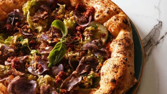 Fiordilatte, fuori cottura, culatta cotta alta qualità, crema di basilico, crema di carciofi violetti, crema di funghi portobello, ristretto di san marzano dop, terra di olive caizzane, origano secco siracusano, basilico e olio evo bio.