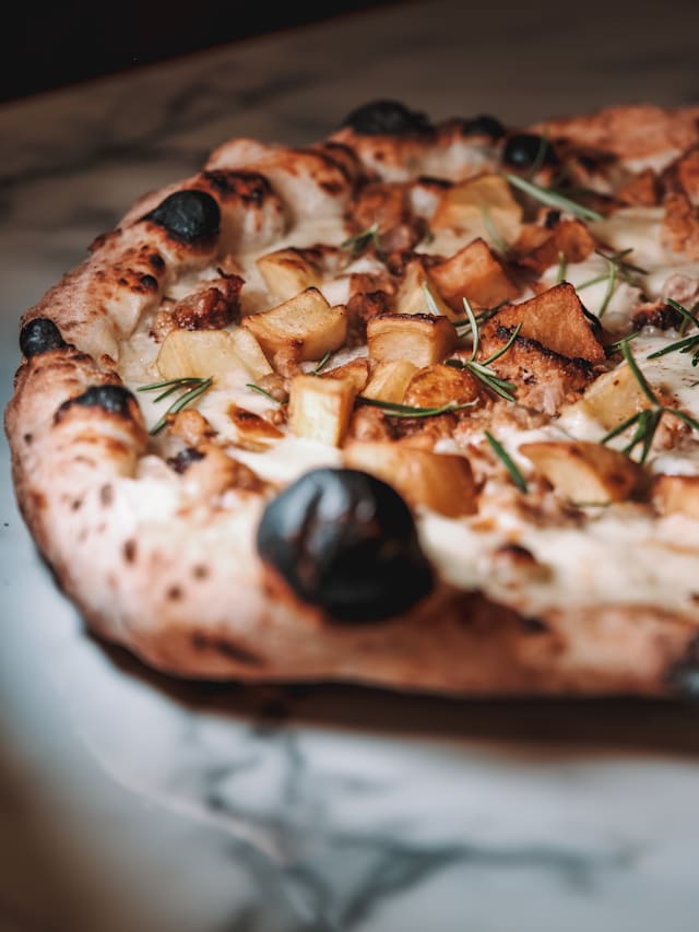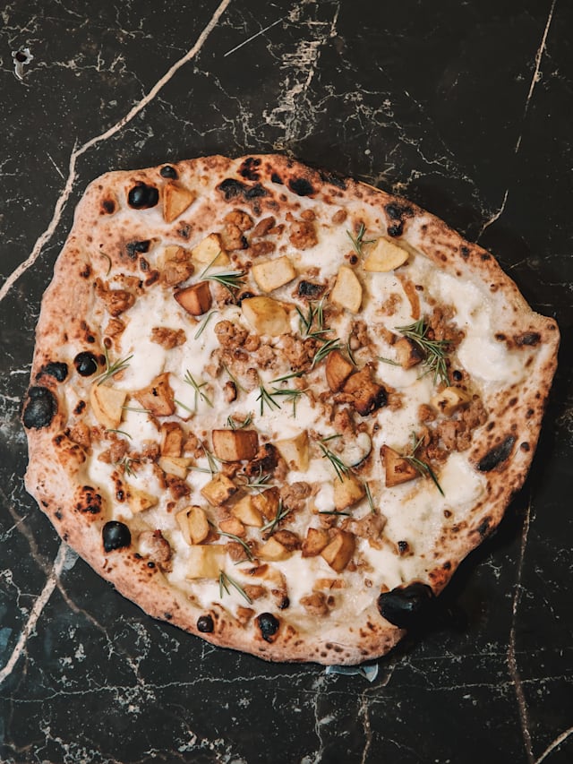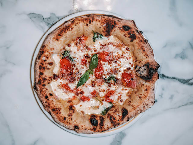 Pomodoro marzanella giallo, guanciale amatriciano, pomodoro pacchetelle del parco nazionale del vesuvio DOP, fior di latte, fuori cottura, fonduta di pecorino romano DOP, cristalli di bacon, pepe nero macinato fresco, basilico e olio evo bio.
