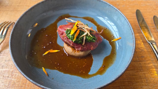 9.3/10Went for dinner at Bij Teus with colleagues and clients. After this lovely experience will certainly come back for more! The interior is trendy and industrial, but feels warm and cozy. The open kitchen with build in green eggs, the 'living room' where you wait to be seated, the 'naughty' objects that pop up here and there, but are not too visable and make you chuckle when noted, make Bij Teus a place you don't want to leave. After being seated, we were told about the former function of the building (no spoilers here!) and the idea of the set menu. No problem if you have any diet wishes, allergies or dislikes as the kitchen staff can fully adjust the menu to your wishes. I was surprised by a lovely 3 course dinner with a burst of taste explosion with every bite. Really liked the 'small glasses' wine arrangement which gave me the taste of a suited wine, but not the amount. The staff was friendly, knowledgable and quick and made us feel very welcome. Overall experience was great! It's been the topic of the morning in the office and we're already planning our next visit.