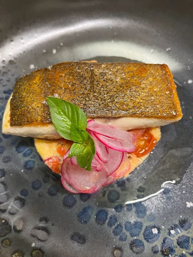 Trancio di ombrina alla mediterranea con crostone di pane ai cereali