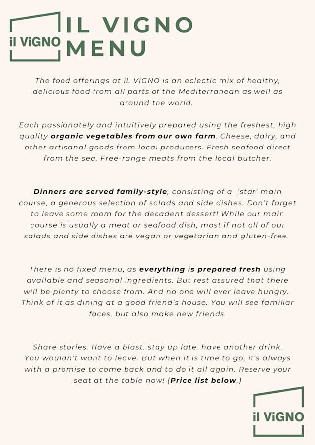 ChefServed family-style at one of our long tables the food offerings at il Vigno is an eclectic mix of healthy, delicious food from all parts of the Mediterranean as well as around the world. Each passionately and intuitively prepared using the freshest, high quality organic vegetables from our own farm. Cheese, dairy, and other artisanal goods from local producers. Fresh seafood direct from the sea. Free-range meats from the local butcher. Dinners are served family-style, consisting of a ‘star’ main course, a generous selection of salads and side dishes. Don’t forget to leave some room for the decadent dessert! While our main course is usually a meat or seafood dish, most if not all of our salads and side dishes are vegan or vegetarian and gluten-free Please note that as our meals are served family-style, and service begins at 7pm. To ensure everyone enjoys their meal together, we kindly ask that all guests arrive on time. Please note that if you arrive after we’ve started, there may be limited food available. We appreciate your understanding and look forward to sharing a wonderful meal with you!