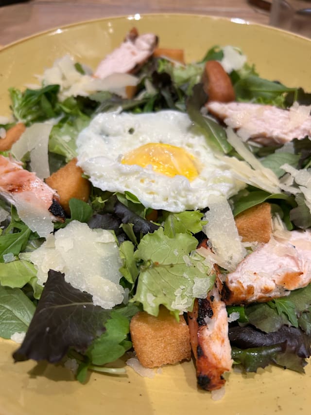 Misticanza, grana padano, tagliata di pollo, uovo, olive nere, crostini e salsa caesar