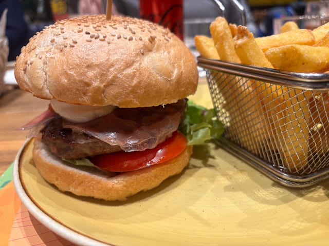 Hamburger, crema di zola, pancetta piacentina croccante, insalata e pomodoro