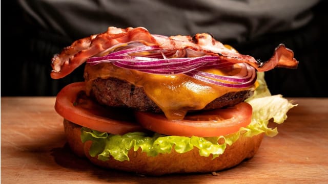 Hamburger, cheddar, anelli di cipolla*, insalata, pomodoro e salsa B&B