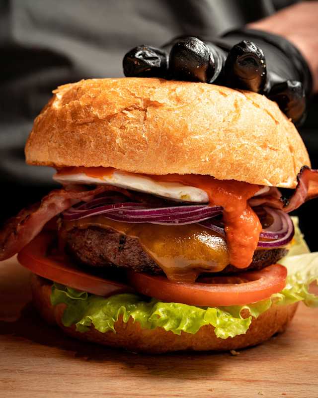 - Hamburger, salsa cheddar, anelli di cipolla, insalata, pomodoro e salsa b&b