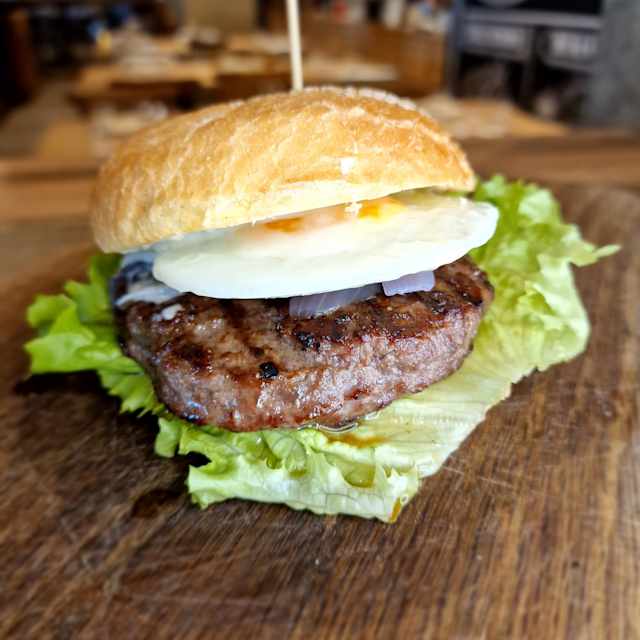 - Hamburger, crema di zola, pancetta piacentina croccante, insalata e pomodoro