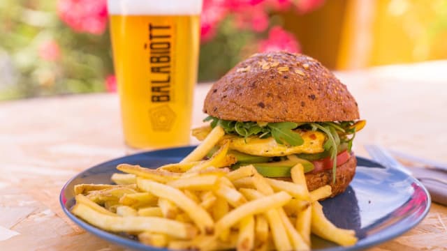 Pane artigianale al burro, hamburger di nostra produzione con carne 100% italiana, orgonzola dolce, guanciale di amatrice croccante, peperoni friggitelli alla griglia e maionese alla paprika.