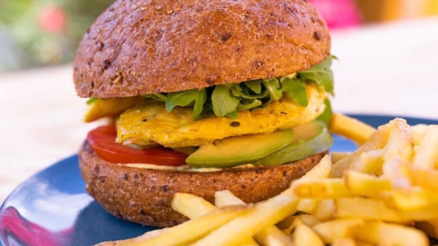 Pane artigianale ai cereali, veggie burger*, (provola dolce), pomodoro ramato, spinacino fresco, avocado e senape leggera.