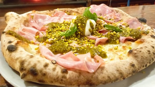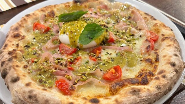 Mozzarella fiordilatte, speck, pesto di pistacchio, granella di pistacchio, bocconcino di bufala al centro