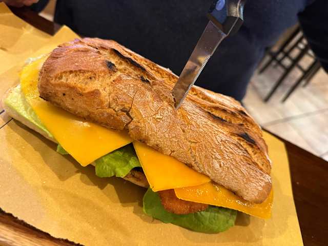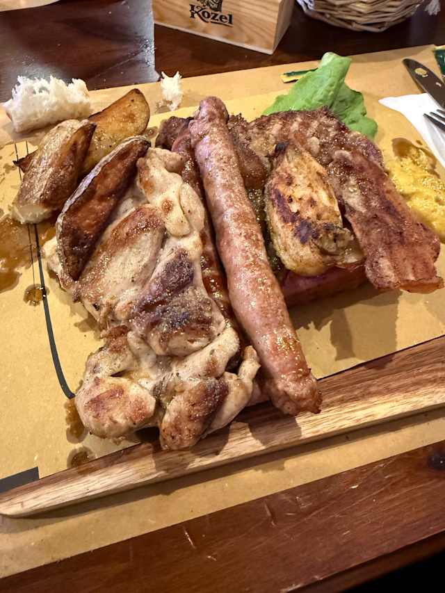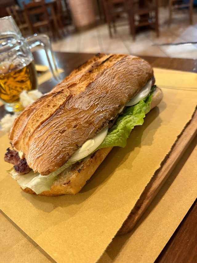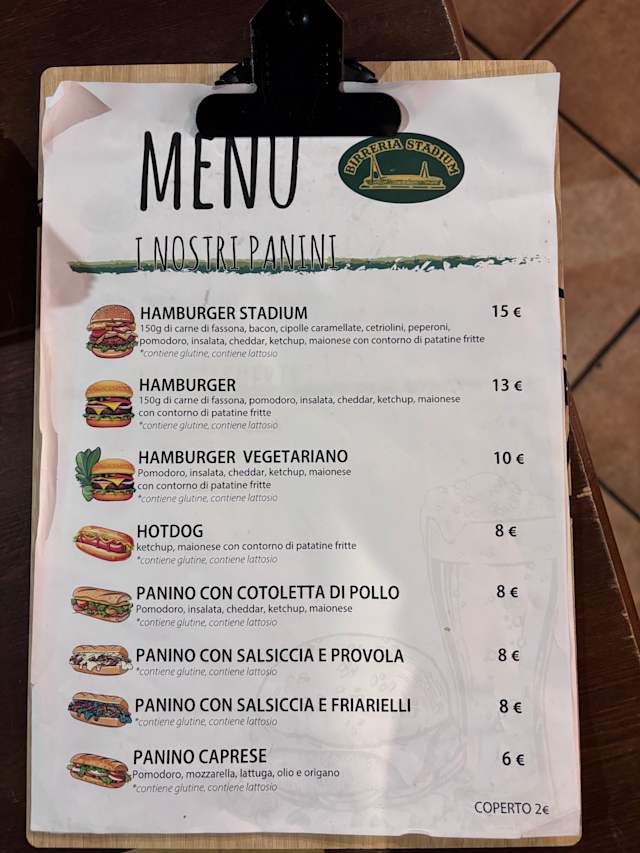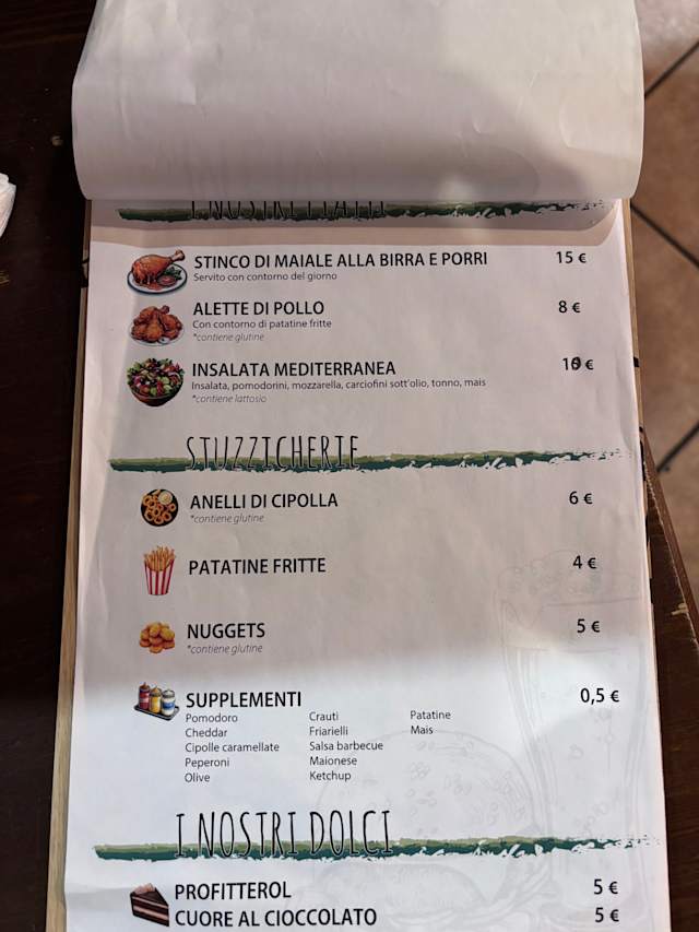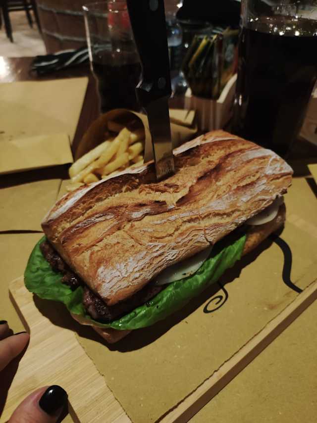 - 150g di carne di fassona, bacon, cipolle caramellate, cetriolini, peperoni grigliati, pomodoro, insalata, cheddar, ketchup, maionese con contorno di patatine fritte
