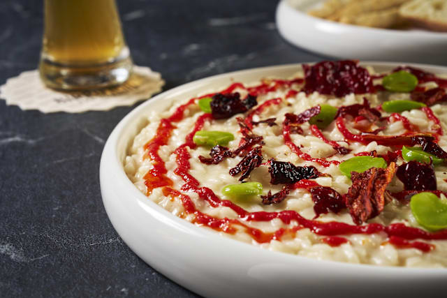 Risotto fave, sesamo, pecorino dolce, crema di pomodorini e peperone crusco.