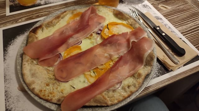 San marzano dell’agro sarnese D.O.P., mozzarella, gorgonzola e dopo cottura speck.