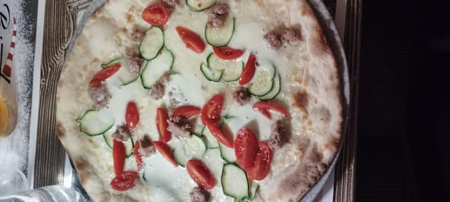San marzano dell’agro sarnese D.O.P., mozzarella, zucchine e melanzane grigliate, olive nere di leccino, datterini, zucca e origano.