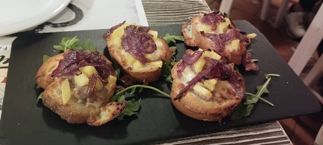 San marzano dell’agro sarnese D.O.P., cipolle rosse flambate al varnelli e dopo cottura burrata e ciauscolo.