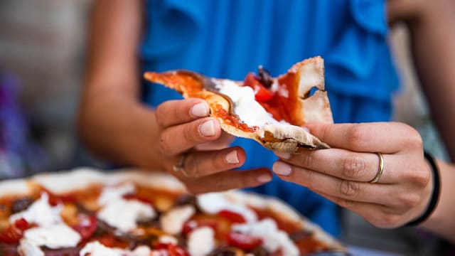 San marzano dell’a san marzano dell’agro sarnese d.o.p., mozzarella, carciofi, tonno e olive nere di leccino.