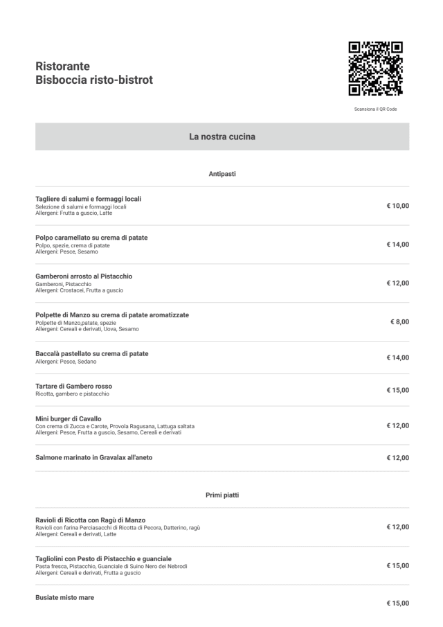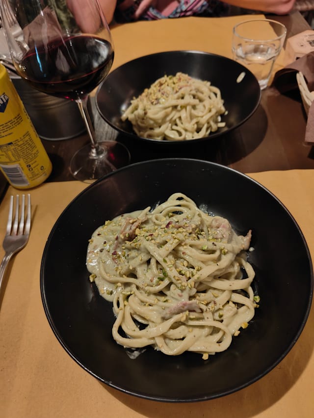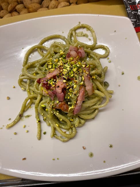 10/10What a wonderful experience we had at Bisboccia tonight! The chef, Walter, cooked the best food of our trip! We enjoyed the polpo (octopus) appetizer, pistachio and pork pasta, and seafood soup - all perfect! Our daughter raved about the French fries and grilled vegetables as well! Chiara helped us pick the perfect wine and explained all the dishes. We are grateful that she speaks such perfect English since we don’t speak much Italian. No problem, Chiara and Walter made us feel extremely welcome! We ended the night with a creative, delicious version of tiramisu as well as “chocolate salami” (not really salami but a delicious, inventive dessert that looked just like it. If you want a memorable and delicious meal, you need to visit Bisboccia! We will definitely return this week. Grazie mille!