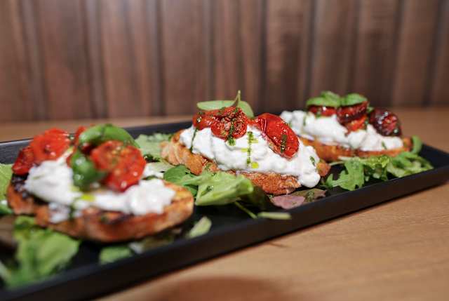 - Olio, sale, ciliegino confit, burrata, emulsione di basilico.