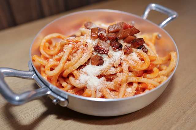 - Bucatini, pomodoro pelato, guanciale, pecorino romano, pepe.