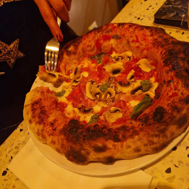- Tomates san marzano, fior di latte, parmiggiano, jambon cuit, champignons de paris frais, artichauts à la romaine, basilic, olives