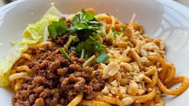 Bœuf mijoté, ciboulette, coriandre, cacahuète, sésame blanc, piment rouge de sichuan, vinaigre, huile de sésame