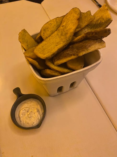 8.5/10FOOD WAS SOME OF THE BEST WE HAVE HAD IN LISBON. THE SERVICE IS SPOTTY. SEVERAL ITEMS ON THE MENU WERE UNAVAILABLE SOME OF WHICH WE ALREADY ORDERED. OUR FIRST SERVER DIDN’T UNDERSTAND OUR DRINK ORDERS EVEN THOUGH WE ORDERED FROM THEIR COCKTAIL MENU. MY WIFE ORDERED A DIRTY MARTINI WITH OLIVES WHICH NO ONE COULD GET. THEY THEN SWAPPED WAITERS. THIS GUY WAS EXCELLENT. ALSO SAT US UPSTAIRS WHICH WAS A BIT TOO WARM AND ALL AMERICANS