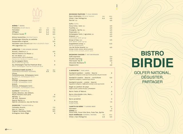 Le Restaurant Club-House "Bistro Birdie", décoré aux couleurs de la Ryder Cup, vous accueille du lundi au dimanche de 7h00 à 20h00. Venez profiter d'un lieu chaleureux et d'une cuisine traditionnelle. Formule express et snacking à emporter.